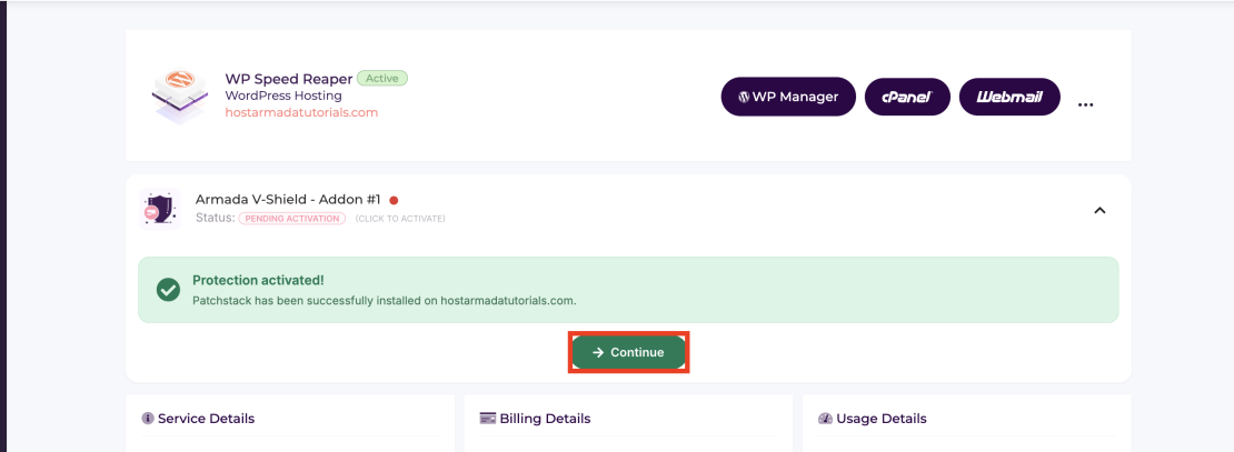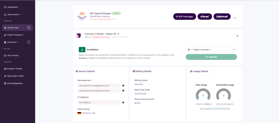 Activating Armada V-Shield is designed to be straightforward and requires no technical knowledge. Since this is an add-on service, you can purchase it with each new HostArmada WordPress Hosting plan or you can add it to your already existing WordPress Hosting plans from the “Addon Boosters” section of your HostArmada Client area.